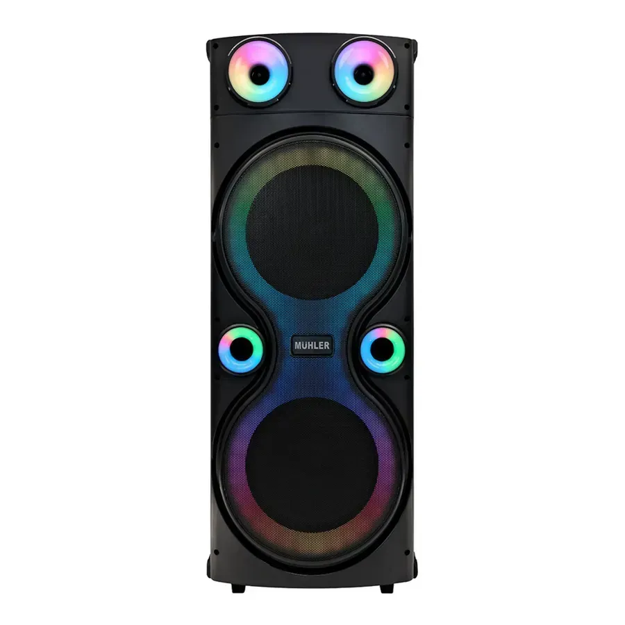 Активна тонколона Muhler MAX125R; Говорител: 2x12''+3''; Функции: USB слот, FM радио, Bluetooth; Цветно осветление; Батерия: 12V/4500mA; Честотна характеристика: 30Hz-20kHz; Съпротивление: 4oHm; Мощност: 80W; Аксесоари: USB кабел, 2бр. безжични микрофони; Цвят: Черен; Нето тегло: 19.00kg; Бруто тегло: 20.60kg; Размери (ВхШхД): 995x400x375mm; Размери опаковка (ВхШхД): 1060x460x435mm; Гаранция за физически лица: 2 години;3915