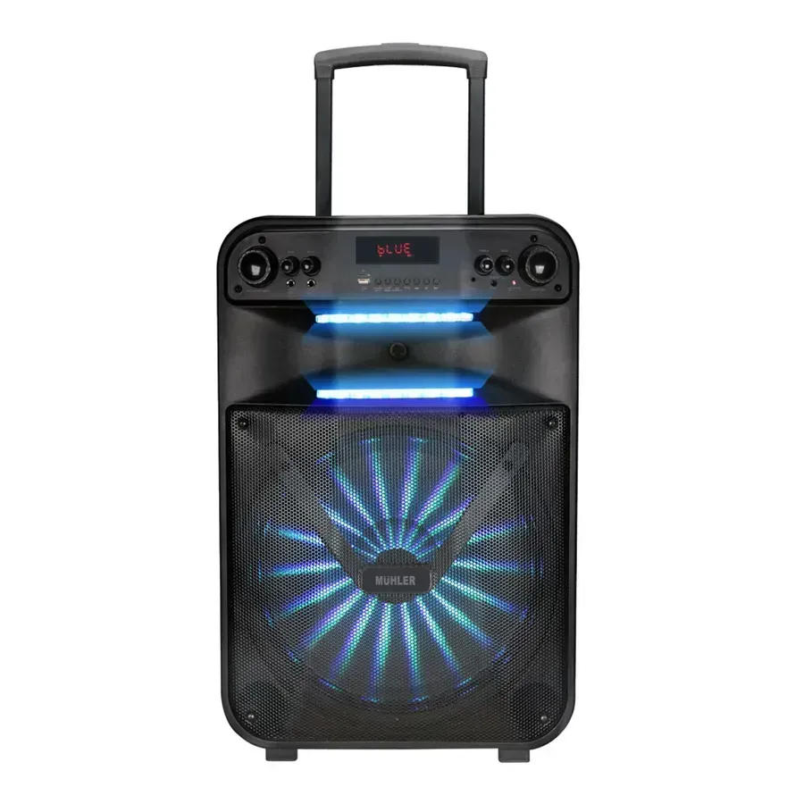 Активна тонколона Muhler MAX150R; Говорители: 15"+1''; Функции: USB/TF слотове, FM радио, Bluetooth; Цветно осветление; Дръжка и колелa; Батерия: 12V/7000mA; Честотна характеристика: 38Hz-20kHz; Съпротивление: 4oHm; Мощност: 80W; Аксесоари: Адаптор за зареждане, 2бр. безжичен микрофон; Цвят: Черен; Нето тегло: 12.65kg; Бруто тегло: 14.53kg; Размери (ШхВхД): 430x685x405mm; Размери опаковка (ШхВхД): 476x725x436mm; Гаранция за физически лица: 2 години;90129