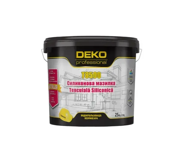 DEKO professional T8500 Силиконова мазилка, драскана структура B2 Готова за употреба пастообразна мазилка на база органично свързващо вещество, силиконова емулсия и специално подбрани пигменти, пълнители и добавки. За вътрешно и външно приложение. За направа на еднослойни защитни и декоративни покрития върху бетонни основи, гипскартон, гипсова шпакловка, циментови мазилки и шпакловки и др. Финишно покритие при изграждане на фасадна топлоизолационна система DEKOTHERM®.40192