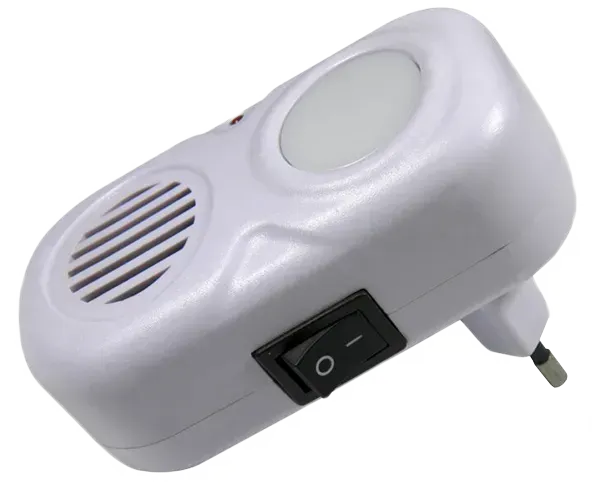 Екологичен уред за дома и други закрити помещения, който работи с ултразвук и изключително ефективно прогонва мишките. Мишките имат силно чувствителен слух и възприемат звуци, които не се чуват от човешкото ухо. Уредът за мишки излъчва ултразвукови звуци в честотния диапазон 20-46 kHz, които звучат изключително неприятно за слуха на животните и ги прогонва. Устройството против мишки действа изцяло без отрова и следователно е особено щадящо животните и околната среда. Подходящ е за жилищни помещения, килери, гаражи или мазета с площ до 30 м². За оптимален успех не покривайте устройството със завеси или мебели. Това ограничава свободното излъчване на звука, което води до по-ниска ефективност. Притежава опция за нощна светлина, която се управлява с превключвател. Ако вече не искате да използвате ултразвуковата функция, просто извадете уреда от контакта.7558