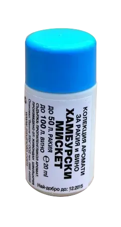 Добавка с аромат на мискет Приложение: В готовата ракия/вино се изсипва и разбърква за постигане на желания аромат Дозировка: 20мл./50л. или по собствен вкус Обем: 20 мл. Сертификат: Да5049