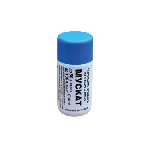 Добавка с аромат на мускат 20 мл, прилага се в готовата ракия/вино и се изсипва и разбърква за постигане на желания аромат. Дозировка: 20 мл./50 л. или по собствен вкус. Има сертификат за качество. Добавка за ракия, предназначена за постигане на специфичен аромат. Според желаната степен на ароматизиране, необходимото количество аромат се смесва добре с алкохола и престоява при стайна температура около 24 ч. След това се дегустира и при необходимост дозата се коригира.5045