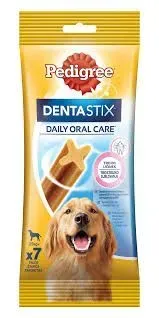 Дентални пръчки за кучета над 25кг Уникална активна съставка с абразивна и дъвчаща текстура (цинков сулфат и STPP) с високо съдържание на калций, ниско съдържание на мазнини и без добавена захар Брашна ( царевица , пшеница), м глицерин, царевичен глутен, Дъвка, птичи черен дроб на прах (натурален аромат на домашни птици), натриев триполифосфат, фибри, калциев карбонат, желатин, калиев хлорид, консервант, аромат, цинков сулфат. Опаковката съдържа 7бр DentaStix8878