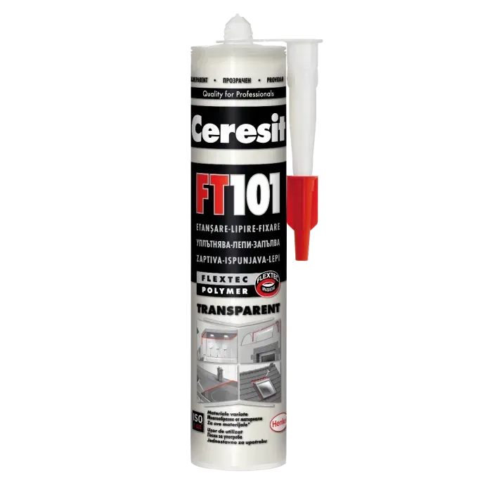 Многофункционален продукт на база Flextec® технология за еластично лепене и уплътнителни работи в строителството като: монтаж на первази на прозорци, подови первази, стълчи, плочки; фуги между дограмата и зида, около рамки на врати, подови фуги; фуги, подложени на движение, и фуги по периметъра; съединителни, дилатационни и декоративни фуги; фуги в модулни сглобяеми елементи, метални обшивки, термопанели, Etalbond; фуги на балкони, тераси и покриви, фуги в метални и дървени конструкции. Ceresit FT 101 е подходящ за множество материали: бетон, тухли/зидария, дърво, камък, мрамор, неръждаема стомана, желязо, боядисани метали, алуминий и други, без PE, PP и тефлон70229