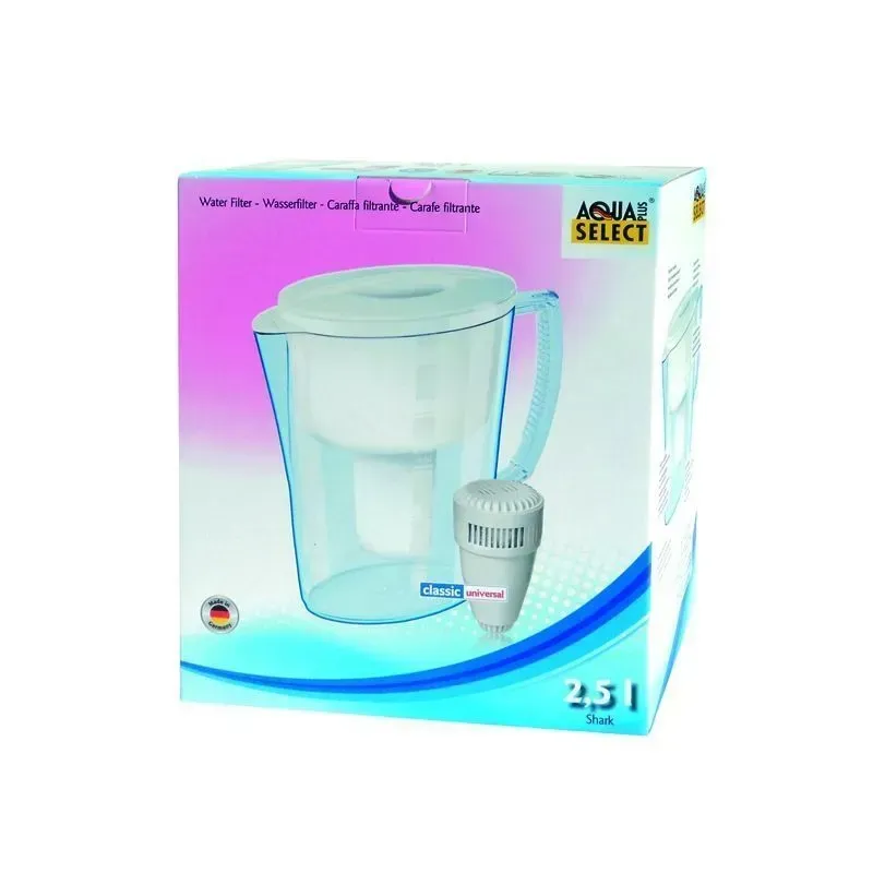 Филтърна кана за вода AQUASELECT - SHARK Classic. Водата е жизнено важна за нас. Водата от водопровода има примеси - разтворени газове, соли и други вещества, които не са полезни за нас и развалят вкусовите качества. Затова качеството и чистотата на водата, която пием всеки ден е от особено значение. Каните AQUASELECT филтрират и пречистват водата, като същевременно ви спестяват средства от покупката на бутилирана вода. Каните AQUASELECT - SHARK Classic е изработена от ABS пластмаса. Силиконовата основа не позволява приплъзване. Обща вместимост на каната е 2.5 л., а обема на филтрираната вода е 1.5 л. Каната се предлага в комплект с един филтърен патрон. Филтърният патрон съдържа йоннообменни смоли и активен въглен. Благодарение на съставките си намалява твърдостта на водата. Филтрираната вода е подходяща за директна консумация и приготвяне на всякакви храни и напитки, включително и за бебешки храни. Филтрираната вода е с по-добър вкус, няма мирзма и е пречистена от хлор, механични примеси, цинк, олово, мед, варовик. Сменете филтърния патрон след 150 литра вода или след 3 месеца. При смяната му използвайте филтърен патрон AQUASELECT Classic с код В26.1672