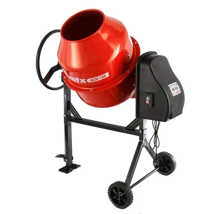 Бетонобъркачка MTX ACM-120 954110 – 550 W, 120 л капацитет, IP44 защита, за груби смеси MTX ACM-120 (954110) е надеждна бетонобъркачка с мощност 550 W и барабан с обем 120 литра, предназначена за приготвяне на бетонови разтвори, мазилки и други строителни смеси. Подходяща за работа с едри фракции до 40 мм, тя предлага обем на зареждане 60 литра, което я прави идеален избор за домашни и полу-професионални приложения.9749